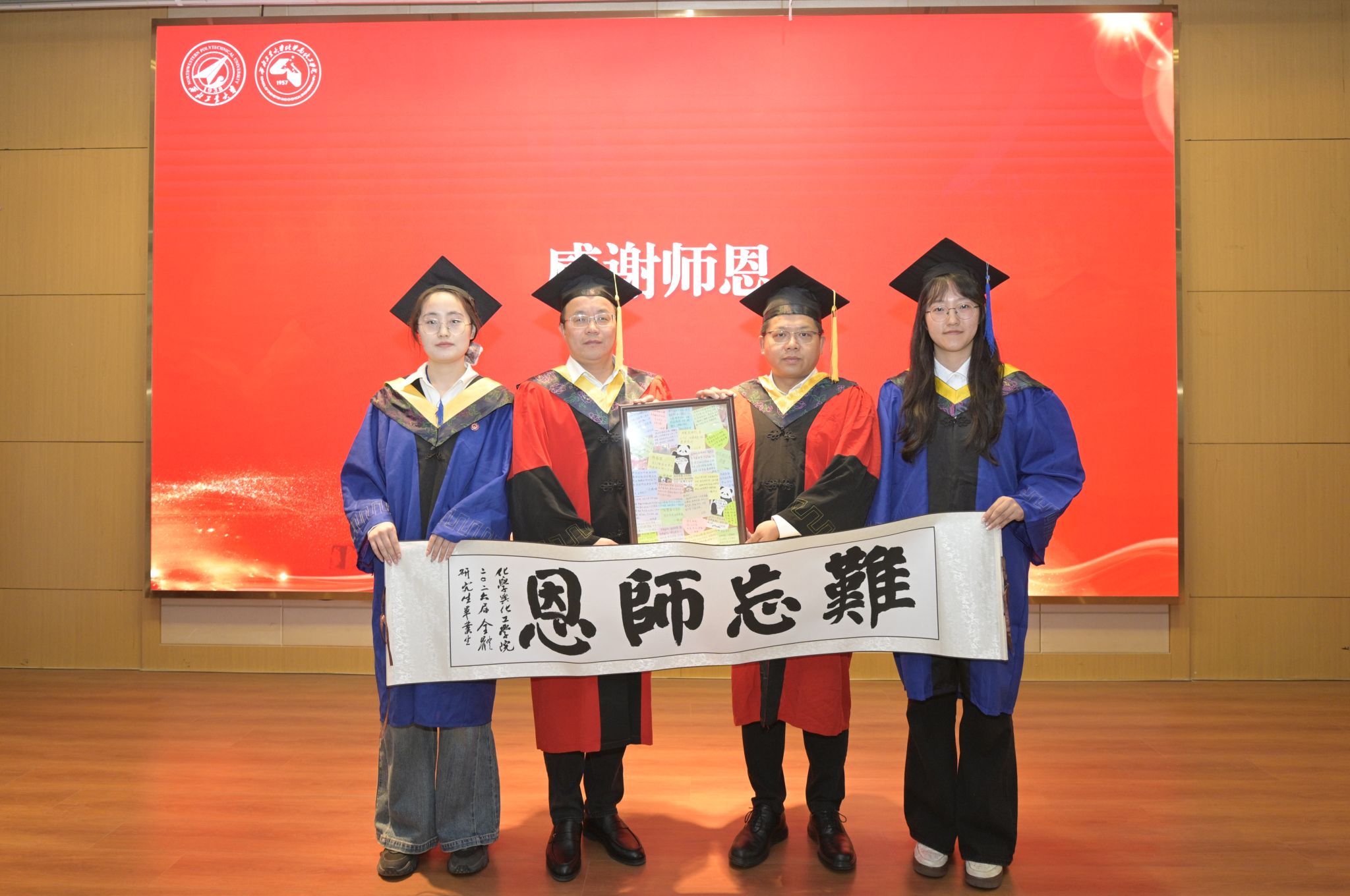 祁佳敏、胡笑枫两位同学代表全体毕业生向老师们敬献心意。一份是同学们亲手书写的“难忘师恩”画轴,以表对恩师的致敬与教诲的铭记;另一份是由20余位毕业生代表共同制作的留言画板,大家将对未来的憧憬、对同窗的祝福、对学院的期许落笔成文,装裱为画框,作为青春的纪念,赠予学院珍藏。
