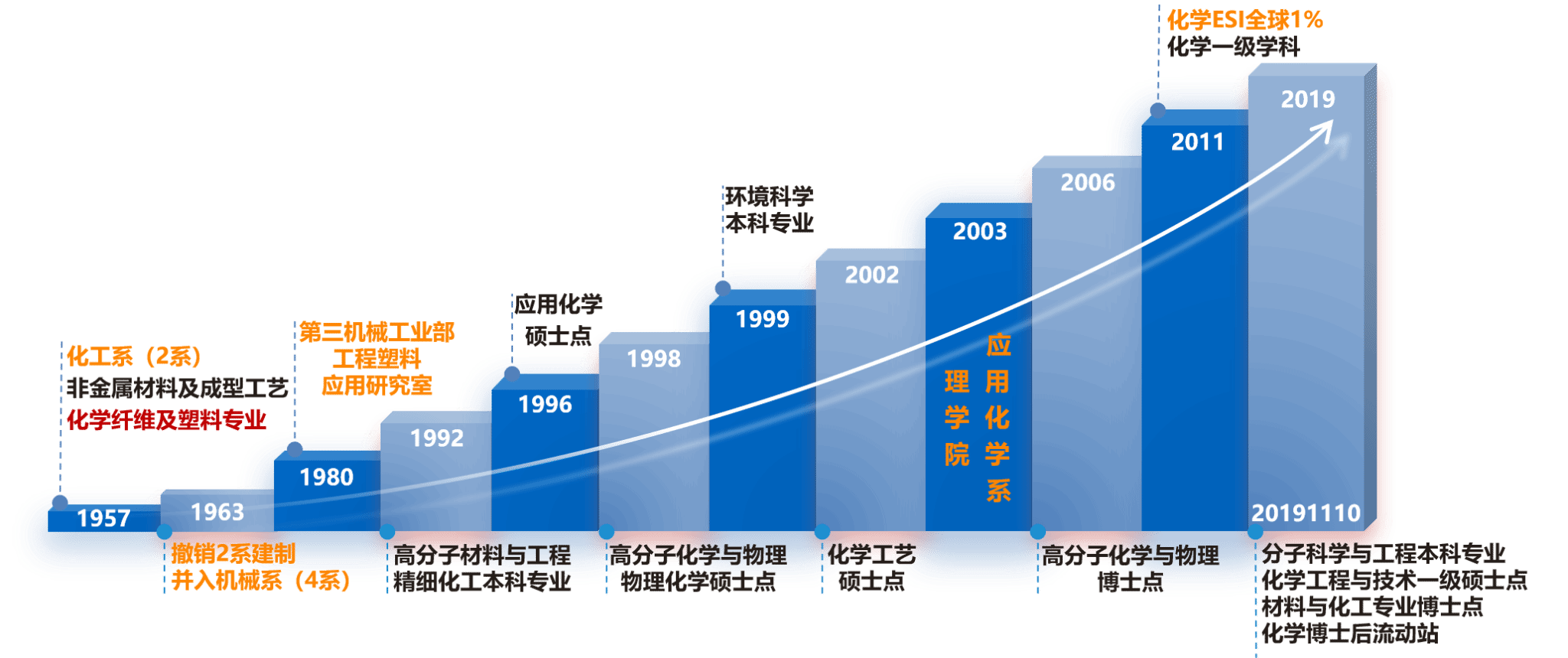 1963年,撤销二系建制,其201、206教研室(非金属材料和普通化学教研室)改为405、406教研室并入机械系(四系,后更名材料科学与工程系),非金属材料及成型工艺专业调整到四系设立,专业代号45,后更名为非金属材料科学与工程、高分子材料(1985年);