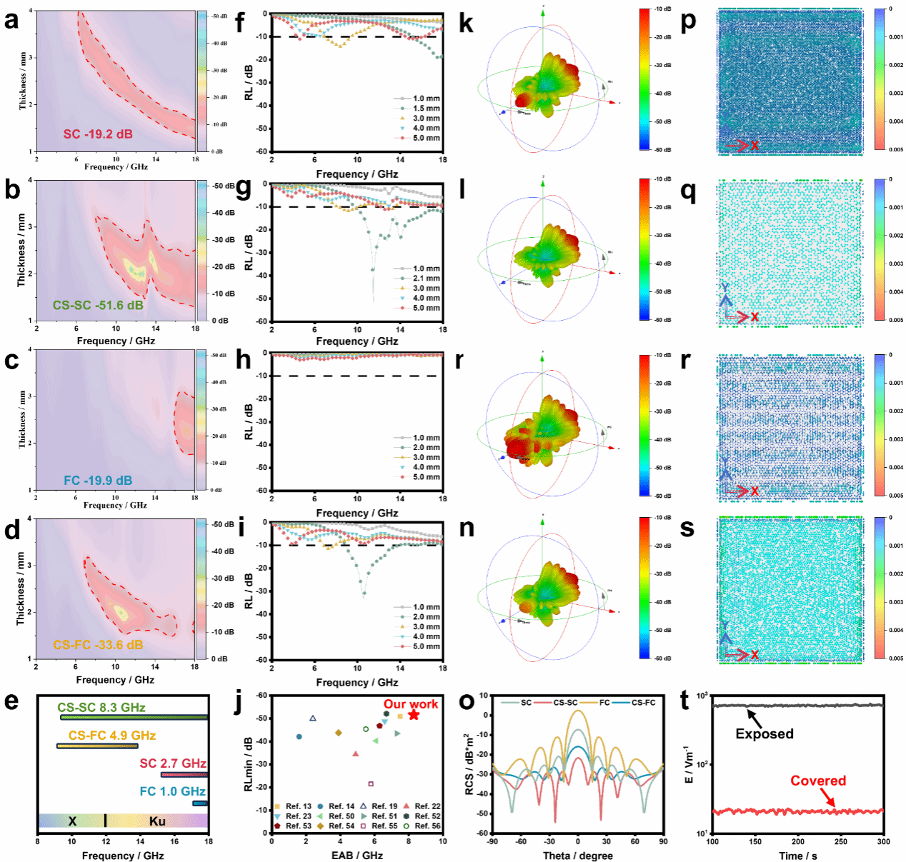 图Co基吸波剂的吸波性能。SC、CS-SC、FC和CS-FC的电磁波吸收性能二维投影图(a~d); SC、CS-SC、FC和CS-FC的EAB(e);SC、CS-SC、FC和CS-FC的电磁波吸收性能随厚度变化谱图(f~i);本工作和本领域已发表工作性能对比(j);SC、CS-SC、FC和CS-FC的RCS三维模拟值(k~n);SC、CS-SC、FC和CS-FC的RCS随入射电磁波角度变化谱图(o);电磁波穿过SC、CS-SC、FC和CS-FC时的能量传输特性模拟图(p~s);应用CS-SC电磁波吸收复合材料前后的电场辐射值(t)。