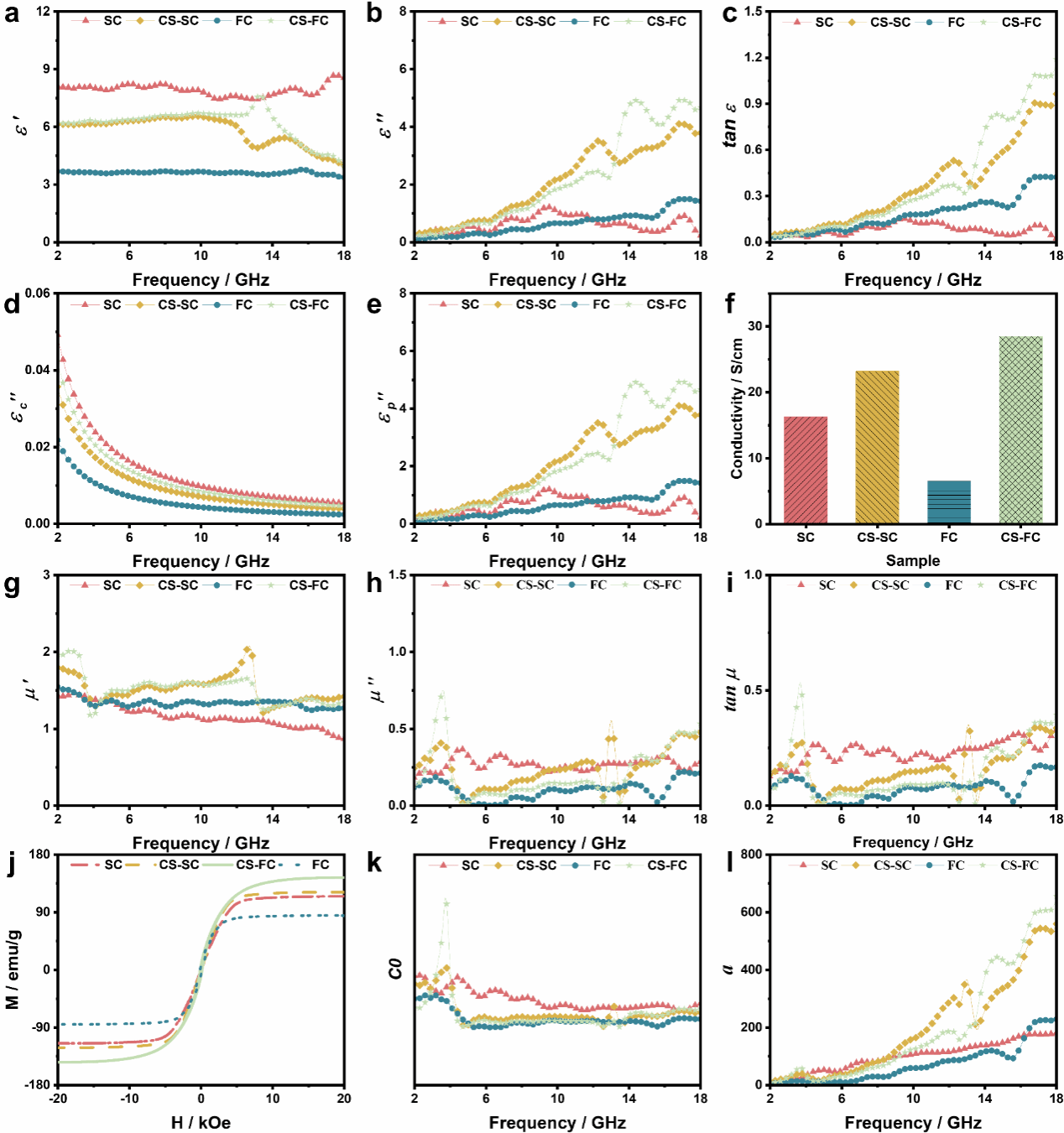图3 Co基吸波剂的电磁性能。SC、CS-SC、FC和CS-FC的εʹ(a)、εʹʹ(b)、tan ε(c)、本征电导率(d)、介电损耗电导分量拟合值(e)、介电损耗极化分量拟合值(f)、μʹ(g)、μʹʹ(h)、tan μ(i),磁滞回线(j)、α谱图(k)、C0谱图(l)。