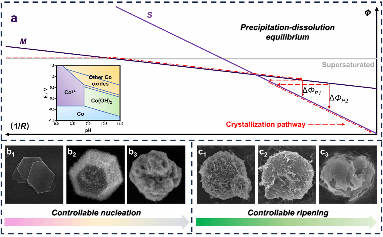 图2 Co基吸波剂的成核和熟化过程。Co成核结晶过程分析示意图及Pourbaix图(a);不同成核条件下片状Co(OH)2(b1)、Wullf多面体Co(b2)和桑葚状Co(b3)的SEM照片;不同熟化条件下SC-1(c1)、SC-2(c2)和SC-3(c3)的SEM照片。