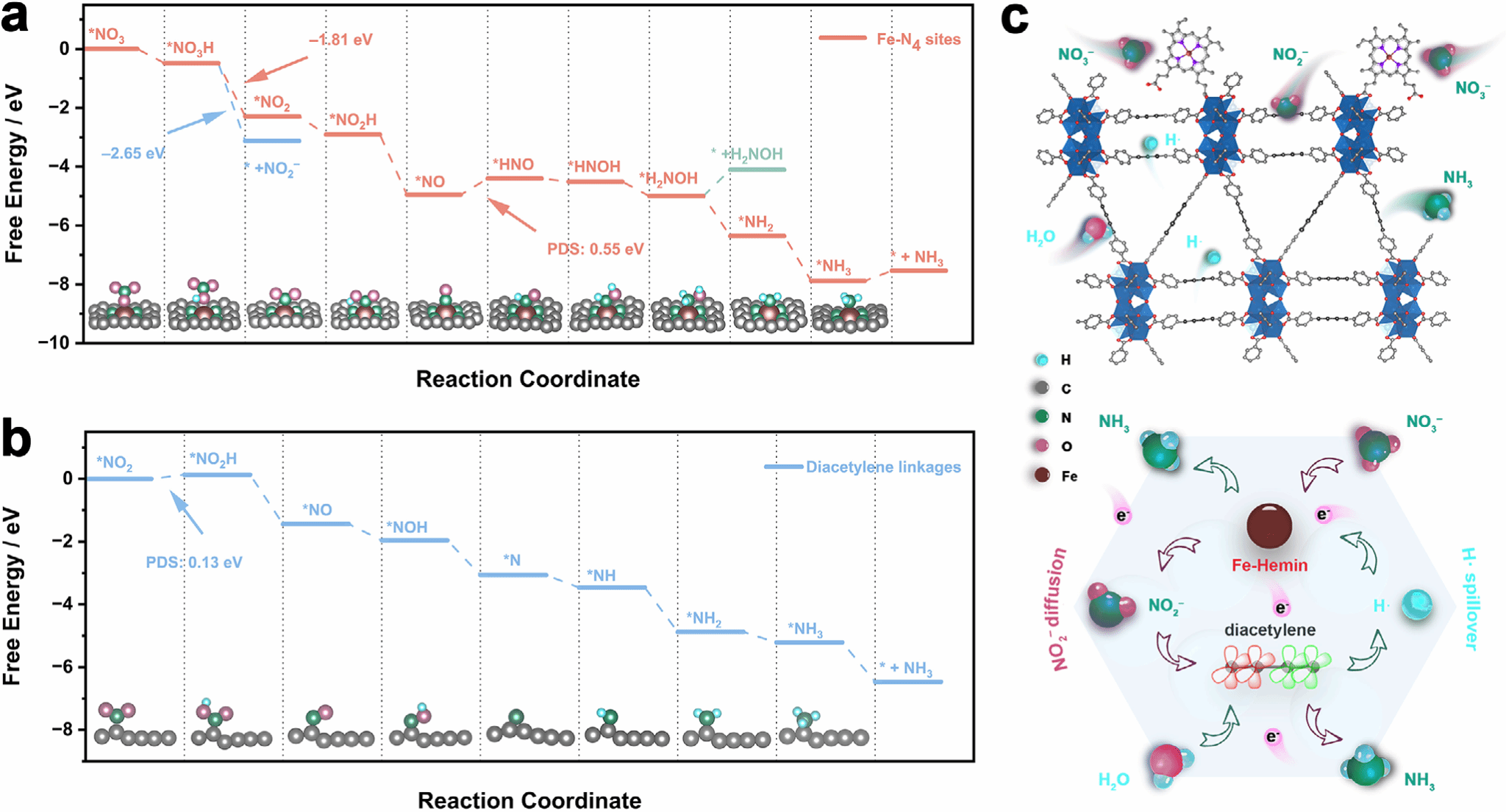 6 aHeminFe-N4位点NO3NH3还原反应过程的中间体自由阶图;bZr-BDDB二炔键NO2NH3还原反应过程中间体自由阶图;cZr-BDDBHemin串联催化NO3NH3过程示意图。