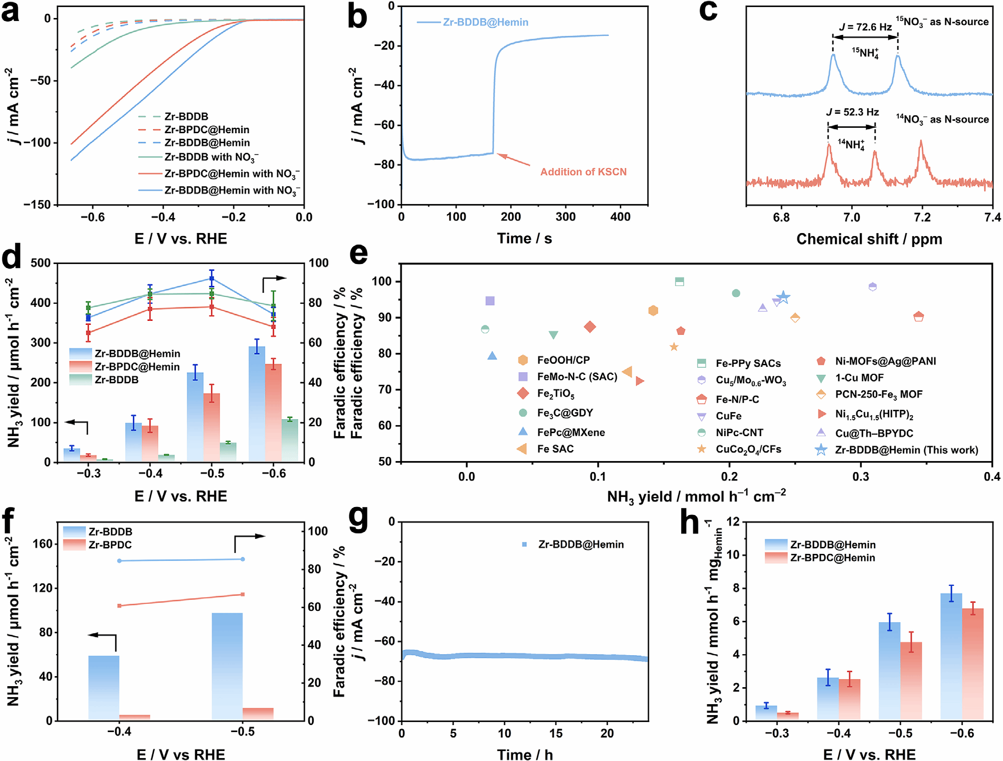 4 Zr-BDDB@HeminZr-BPDC@HeminZr-BDDBaLSV曲线bKSCN毒化活性位点实验;c14NO315NO3作为N源的1H NM谱图;d)电催化NO3NH3产率和法拉第效率e其他已报道电催化剂的性能比较f)有无双炔键MOFs电催化NO2NH3的产率和法拉第效率g稳定性测试曲线h)质量归一化的氨产率