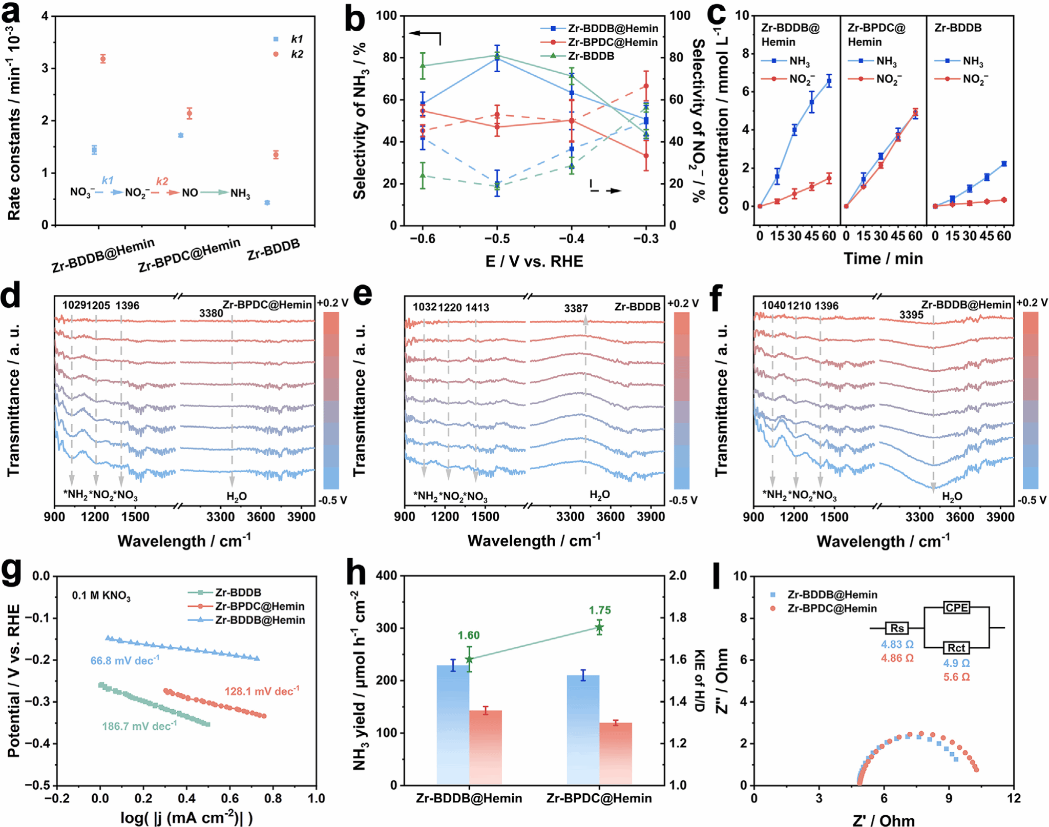 5 Zr-BDDB@HeminZr-BPDC@HeminZr-BDDB MOF1 M KOH+0.1 M KNO3溶液中的a速率常数bNH3的选择性c)产物浓度-时间变化曲线d-f原位红外谱图gTafelhH/D同位素动力学图i阻抗图