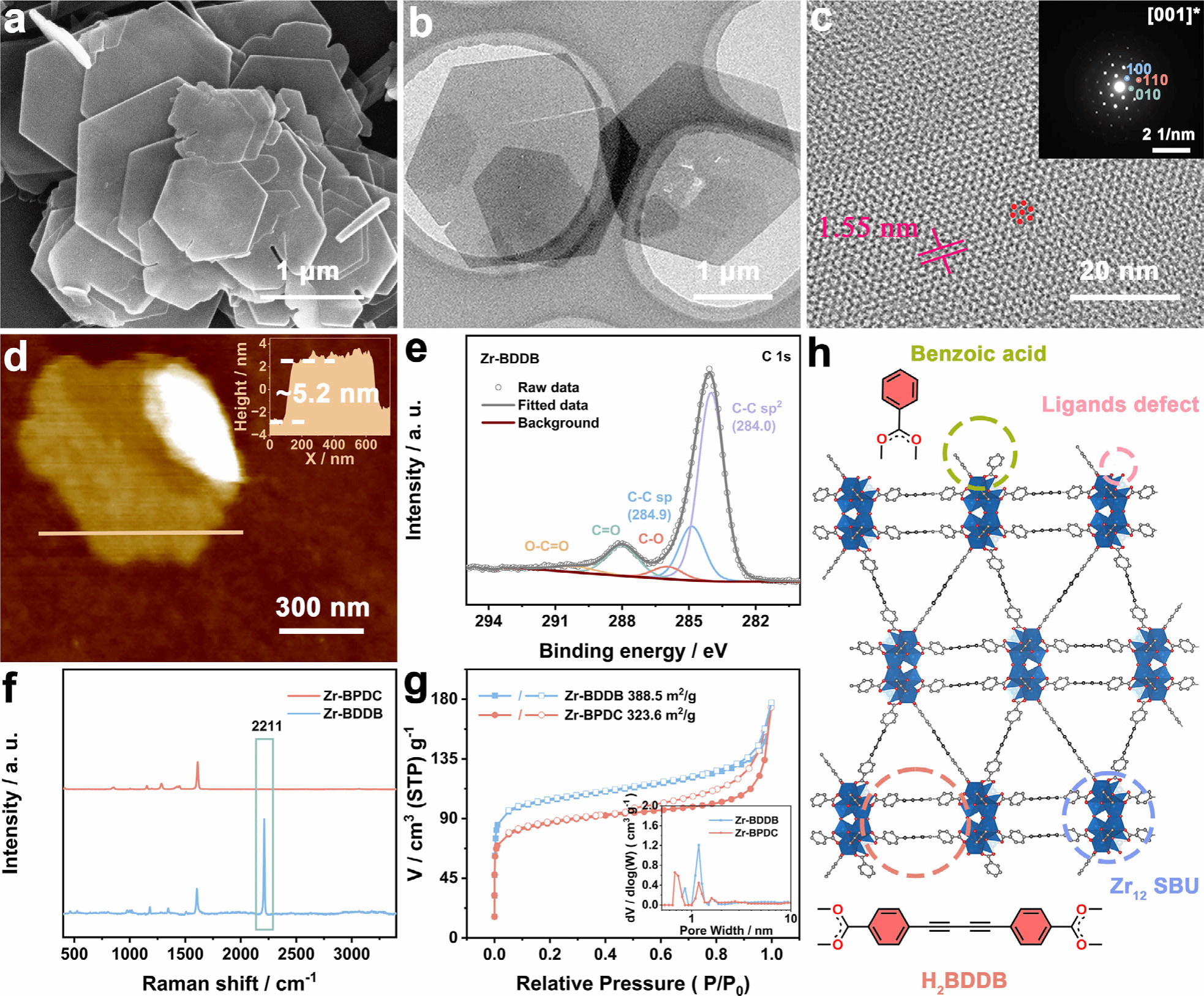 2 Zr-BDDBaSEM图像;bTEM图像;cHRTEM图像;dAFM图像,eC 1s XPS谱图fRaman谱图gN2脱附等温线与孔径分布;h)结构示意图。