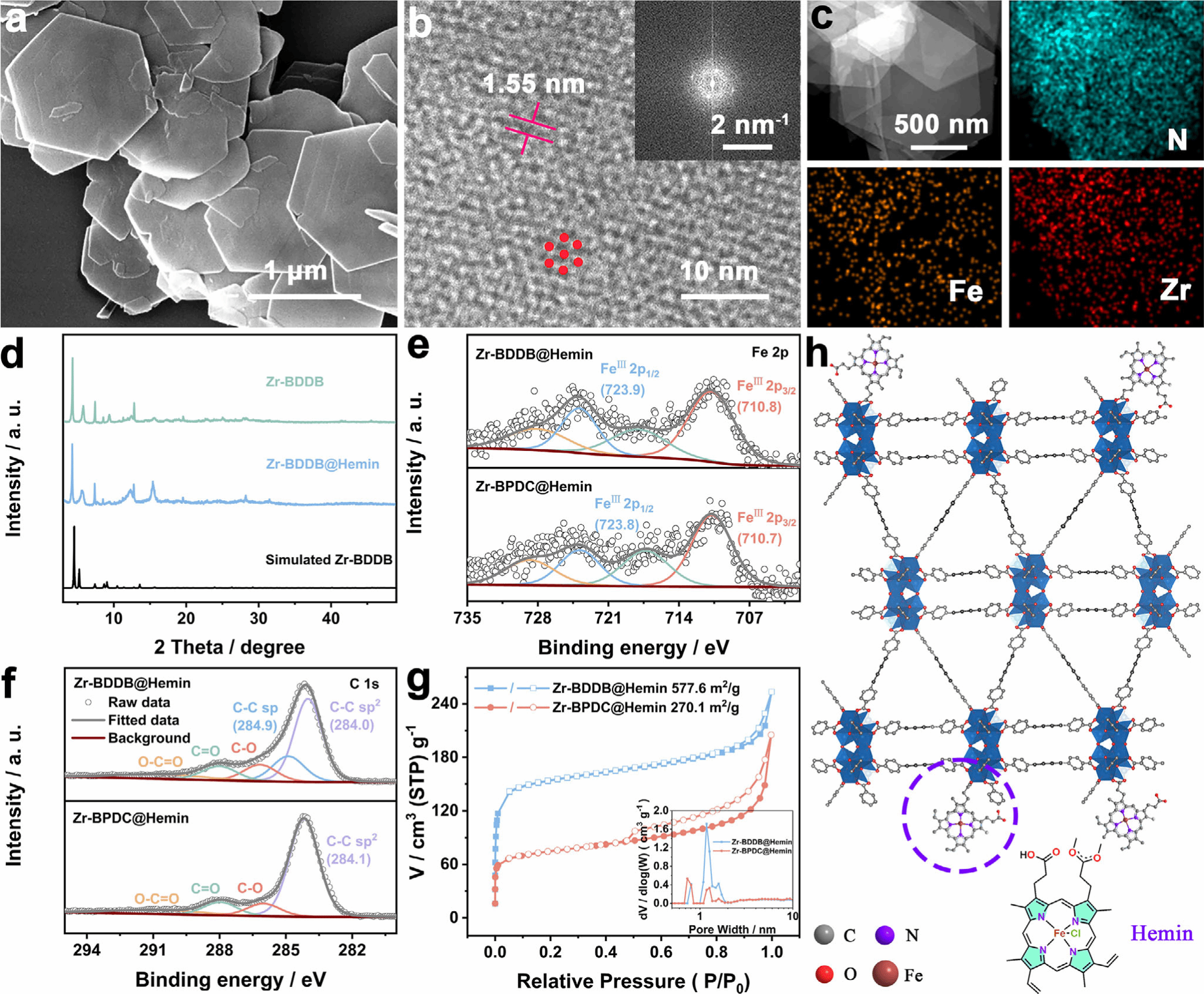 3 Zr-BDDB@HeminaSEMbHRTEMcTEM-EDS图像,h结构示意图。Zr-BDDB@HeminZr-BPDC@HemindXRD谱图eFe 2 pfC 1s XPS谱图gN2脱附等温线与孔径分布。
