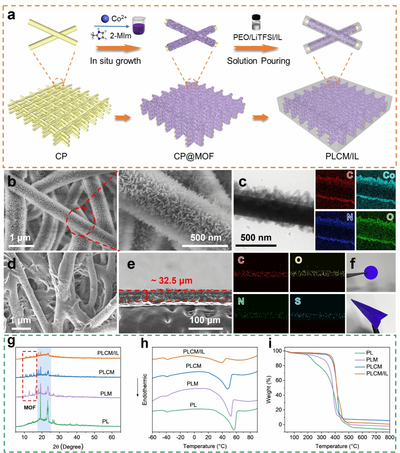 图2 PLCM/IL电解质制备过程示意图 (a)。b CP@MOF纤维的SEM图像 (b)和TEM图像及EDS元素分布图像 (c)。PLCM/IL的表面与截面的SEM图像 (d,e)。PLCM/IL的光学照片 (f)。PL、PLM、PLCM及PLCM/IL的XRD图谱 (g) 、DSC曲线 (h)和TGA曲线 (i)。