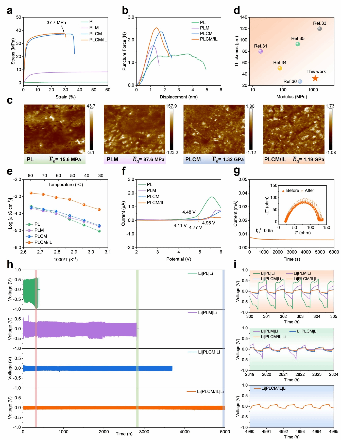 图3 PL、PLM、PLCM及PLCM/IL的应力-应变曲线 (a) 和穿刺强度 (b);通过原子力显微镜(AFM)获得的弹性模量分布图 (c);近年来报道的CSEs的杨氏模量与电解质厚度的对比 (d);CSEs的离子电导率 (e)、线性扫描伏安(LSV)曲线 (f)、锂离子迁移数 (g); Li|Li对称电池在0.2 mA cm⁻²电流密度下的长循环性能 (h)及其在不同循环区间的局部放大电压曲线 (i)。