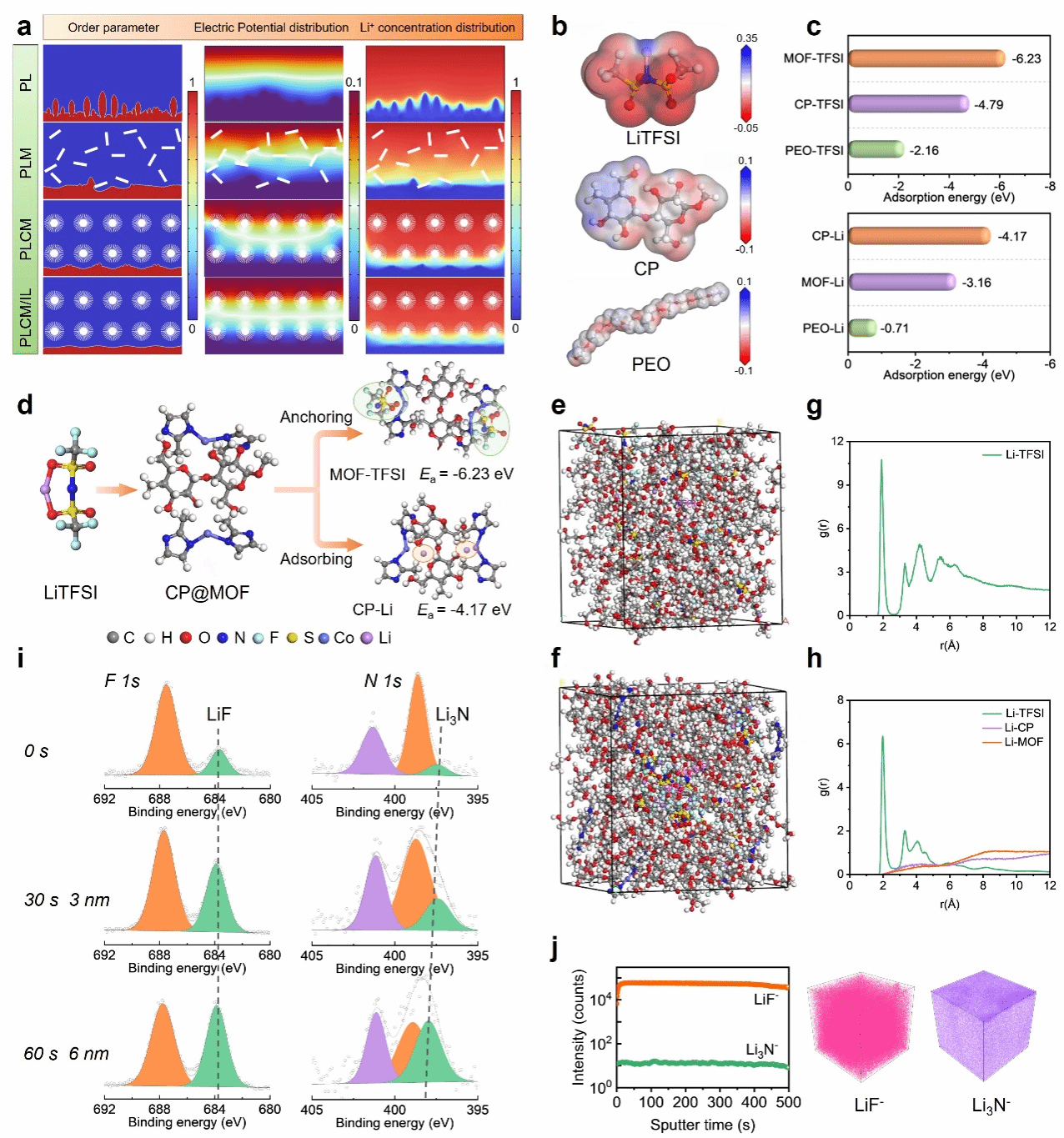 图4 CSEs电解质的序参数、电势分布及Li⁺浓度分布随时间变化的模拟快照 (a);LiTFSI、CP和PEO分子的静电势图 (b);解离的TFSI⁻和Li⁺在PEO、CP和MOF上的吸附能 (c);展示CP@MOF对LiTFSI锚定与吸附作用的优化原子模型 (d);基于分子动力学模拟的 PL电解质 (e)与PLCM/IL电解质 (f)系统的快照;在303.0 K下分子动力学模拟轨迹计算的PL电解质 (g)和PLCM/IL电解质 (h)体系中LiTFSI、Li-CP及SN-MOF对的径向分布函数g(r);循环100小时后PLCM/IL电解质表面的F 1s与N 1s元素的XPS谱及其深度剖析图 (i),以及PLCM/IL电解质表面的TOF-SIMS深度剖析图及相应的LiF⁻和Li₃N⁻三维谱图 (j)。