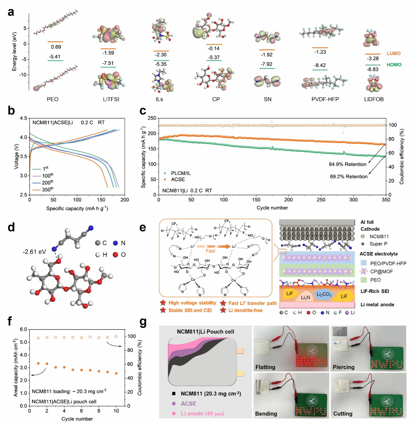 图6 PEO、LiTFSI、ILs、CP、SN、PVDF-HFP及LiDFOB的分子结构及其计算得到的HOMO/LUMO能级 (a);NCM811|ACSE|Li电池在0.2 C倍率下的充放电电压曲线 (b) 和0.2 C下的长循环性能 (c);通过密度泛函理论(DFT)计算得到的CP-OH与SN–C≡N之间的结合能 (d);NCM811|ACSE|Li电池中锂离子传输过程的示意图 (e);NCM811|ACSE|Li软包电池的循环性能 (f);基于ACSE复合固态电解质的固态锂金属软包电池在平整、弯曲、穿刺及剪切状态下仍正常工作状态的照片 (g)。