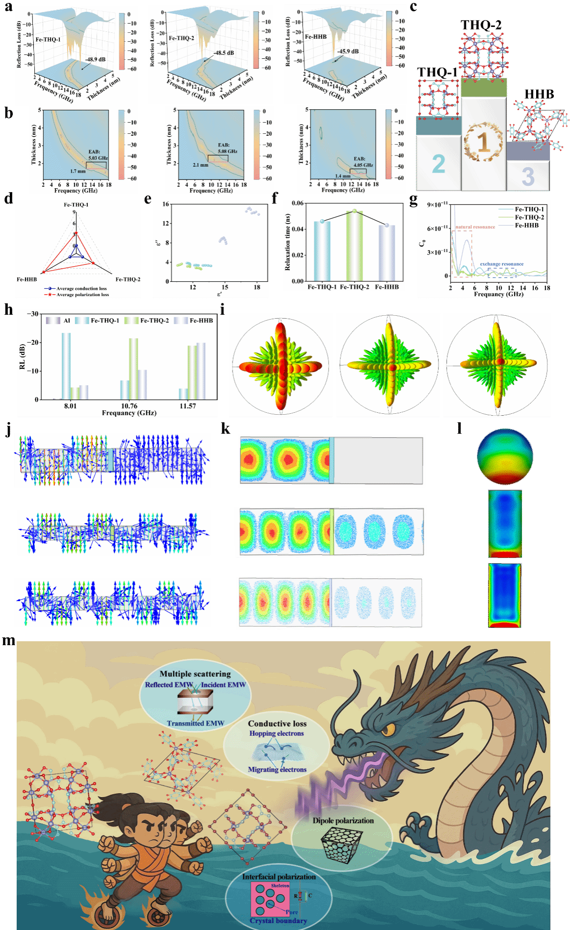 图4 a) 三维RL图;b) 二维RL填色图;c) 性能对比示意图;d) 损耗分解图;e) Cole-Cole图;f) 弛豫时间对比图;g) C0曲线;h) RCS损耗对比图;i) RCS三维图;波导图:j) 电场,k) 磁场;l)总能量损耗图;M)吸波机理图