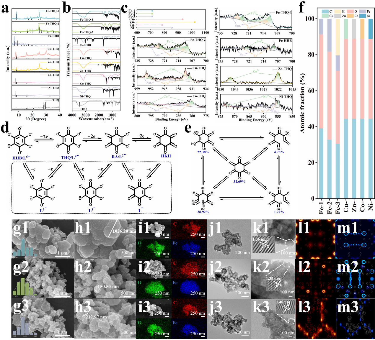 图2 a) XRD图;b) FTIR图;c) XPS图;d) 去质子化产物多种氧化态及过渡态;e) C6O6的Lewis结构;f) 晶胞中各个原子的占据比例;对于Fe-THQ-1、Fe-THQ-2和Fe-HHB:g, h) SEM;i) EDS;j, k) TEM;l) 常距离模式的STM;m) 常电流模式的STM