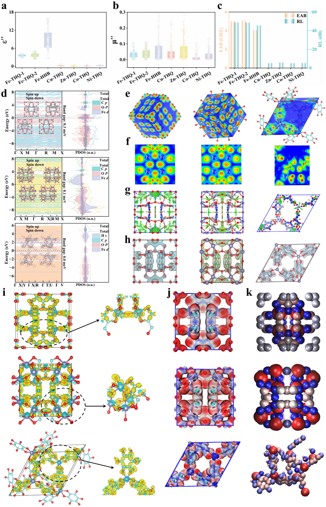 图3 a) e'';b) μ'';c) EAB和RL;d) EBS、PDOS和前线自旋轨道;e) 晶胞表面的ELF;f)不同晶面的ELF;g) IRI;h) π电荷密度;i) 差分电荷密度;j) 静电势图;k) Bader电荷