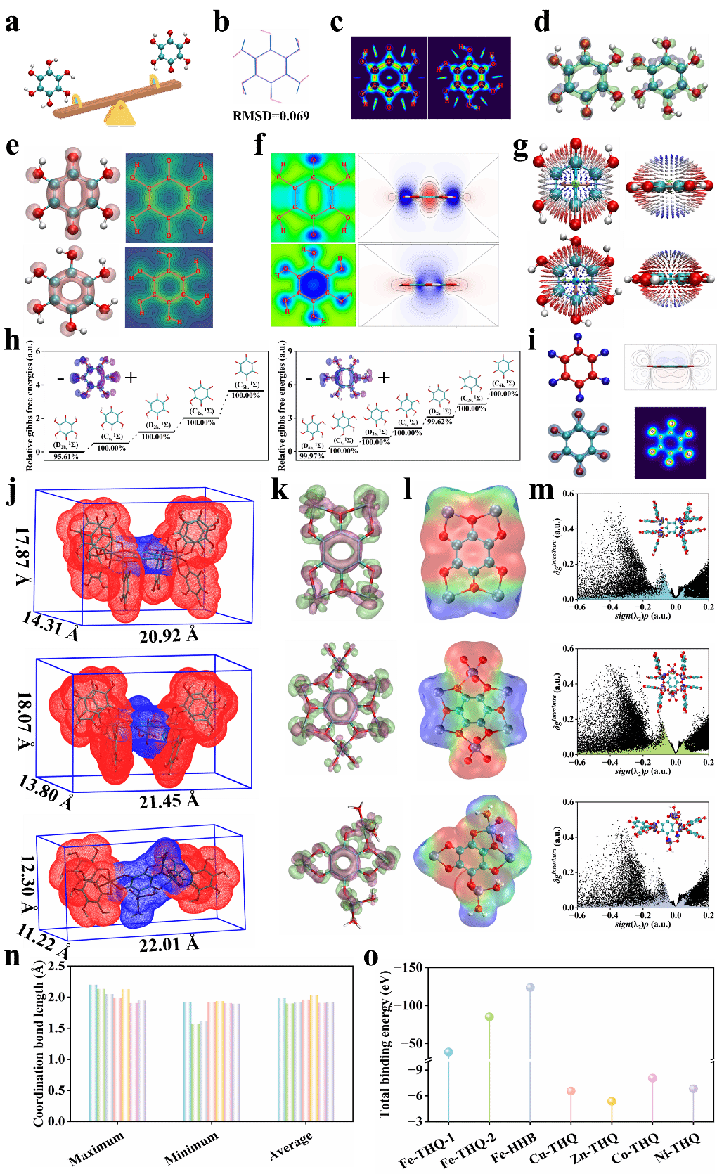 图1 a) THQ和HHB优势构象的相对能量大小; b) RMSD; c) IRI;d) 原子间的差分电荷密度;e) π电子布局等值面和填色图;f) 平行和垂直于环的核独立化学屏蔽表面;g) 极化率张量;h) 电场中的差分电荷密度和去质子化过程;i) 去质子化结构的电荷密度填色图、π轨道、最外层电荷等值面和填色图;j) 三维cMOFs配位单元尺寸;k) 金属离子和有机框架间的差分电荷密度;l) 静电势图;m) IGM;n) 配位键长;o) 总结合能