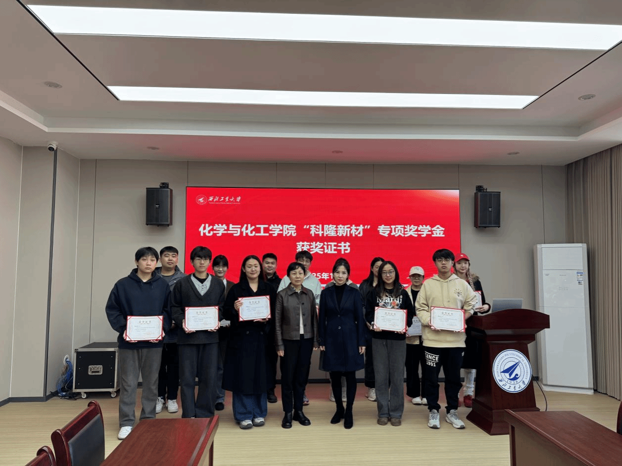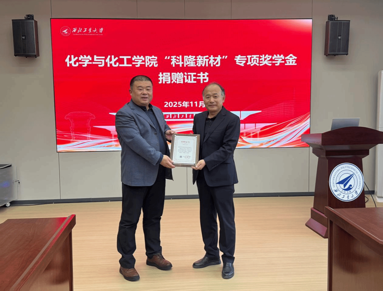 2025年11月11日,西北工业大学化学与化工学院“科隆新材”专项奖学金捐赠暨颁奖仪式在长安校区隆重举行。陕西科隆新材料科技股份有限公司(以下简称科隆新材)副总经理傅小林、财务总监杨锦娟和人力资源部部长姚瑶,学校对外联络办公室副主任苟兴旺,化学与化工学院党委书记傅茂森、副院长田威、张宝亮、办公室主任郑虹、国际化秘书高珊珊以及获奖学生代表参加。田威主持本次捐赠暨颁奖仪式。