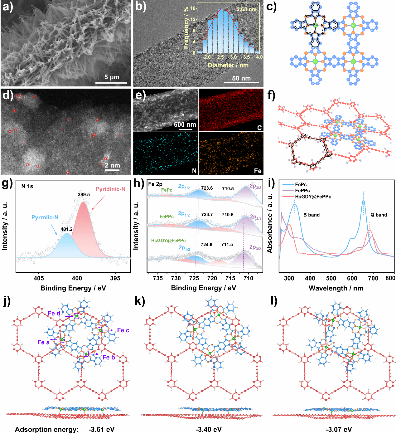 3 HsGDY@FePPcaSEM图像;bTEM图像;dHAADF-STEM图像;eTEM-EDS图像;g,hN 1sFe 2p XPS图;iUV-Visc,fFePPcHsGDY@FePPc的结构示意图j-lHsGDYFePPc之间的配位结构及相应的吸附能。