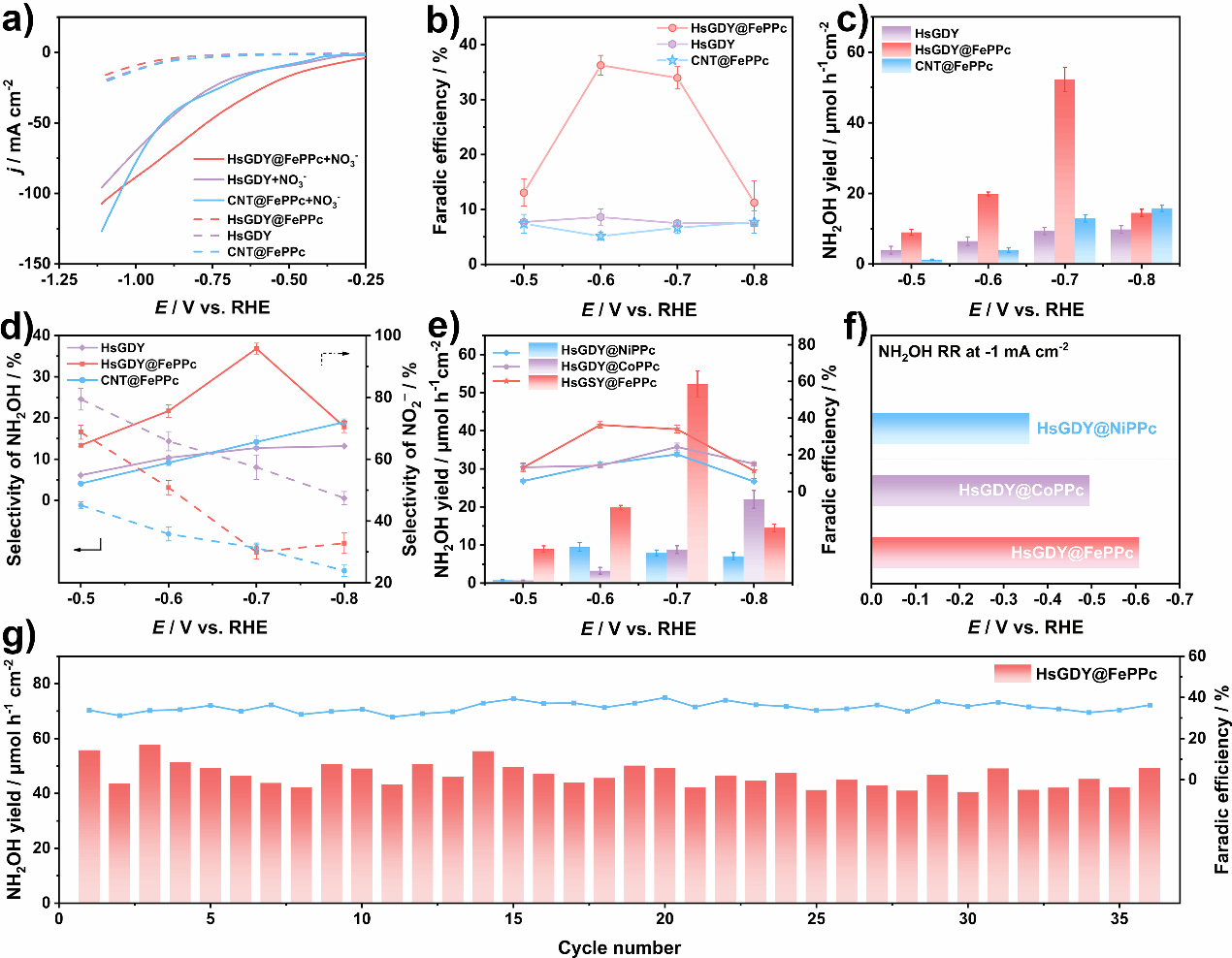 4 HsGDY@FePPcCNT@FePPcHsGDYaLSV曲线b不同电位下法拉第效率c羟胺产率以及d选择性HsGDY@MPPcM=FeCoNi)不同电位下e法拉第效率和羟胺产率以及dNH2OH电还原的起始电位gHsGDY@FePPc−0.7 V vs.RHE下的长期循环性能