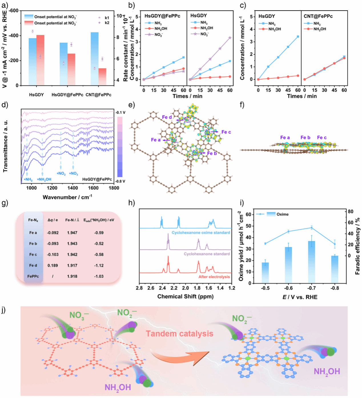 5 aHsGDYHsGDY@FePPcCNT@FePPcNO3NO2还原中的反应速率常数b,c产物浓度-时间变化曲线。dHsGDY@FePPcNO3电还原过程中的原位FTIRe,fHsGDY@FePPc差分电荷密度图与g) 对应的Δq值、Fe-N键长和*NH2OH的吸附能h环己酮肟的1H-核磁共振谱i环己酮肟的法拉第效率和产率jHsGDYFePPc之间串联催化过程示意图