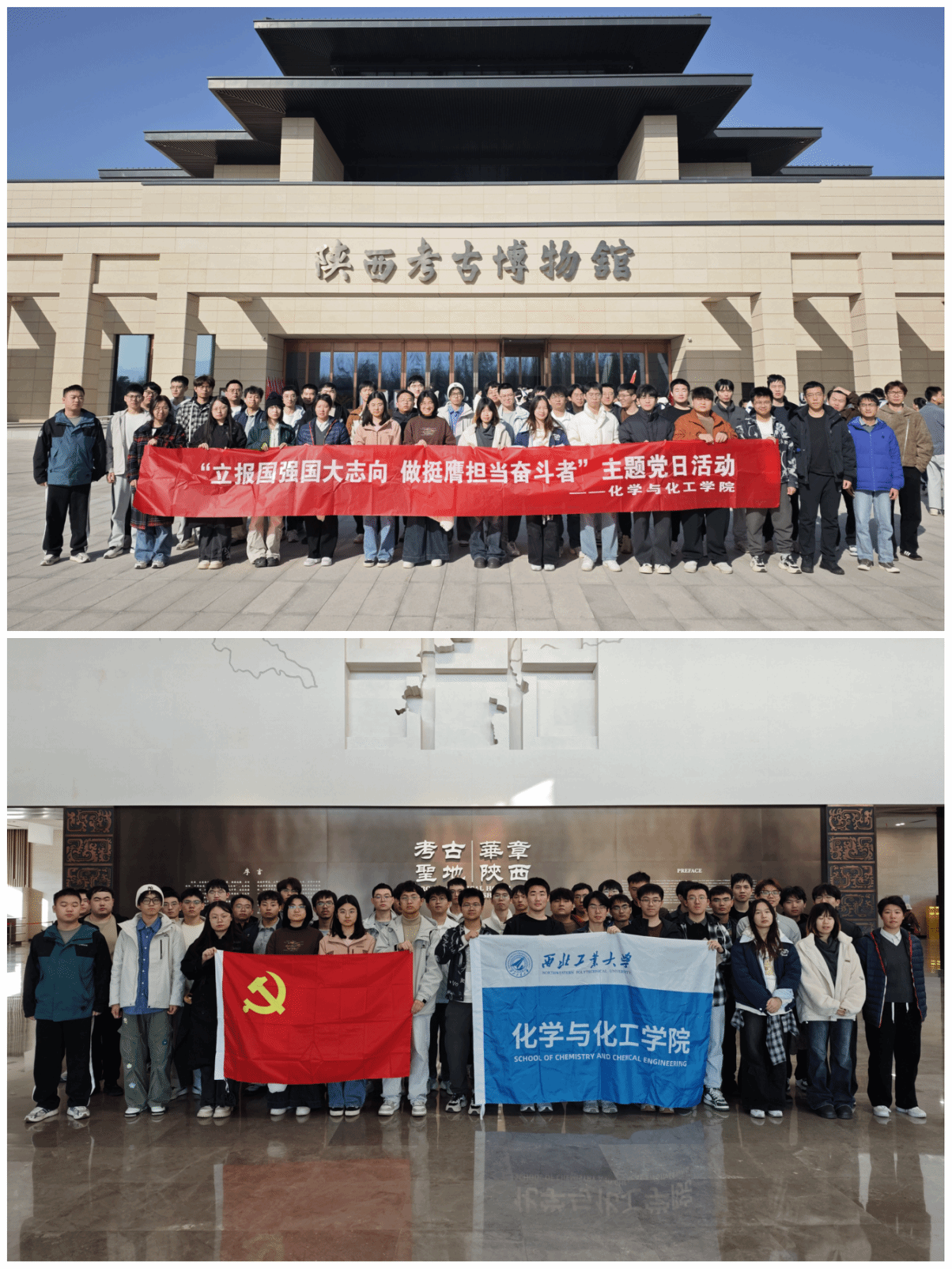 11月20日,化学与化工学院本科生第一党支部组织40余名学生党员、发展对象和入党积极分子,前往陕西考古博物馆开展“立报国强国大志向 做挺膺担当奋斗者”主题党日活动。在博物馆内,师生们依次参观了“考古历程”“文化谱系”“考古发现”“文保科技”等展厅。从石峁遗址的宏大城防,到西周青铜器的精密铸造;从古代壁画的修复技艺,到出土器物的成分分析,同学们不仅为源远流长的中华文明感到震撼,更深刻体会到化学、材料等科学技术在文物发掘、保护与研究中发挥的关键作用。此次沉浸式的主题党日活动,打通了历史与现实、专业与思政的壁垒,极大激发了同学们的专业自信。同学们深受触动,纷纷表示要把个人所学融入国家重大战略需求,争做担当民族复兴大任的时代新人。