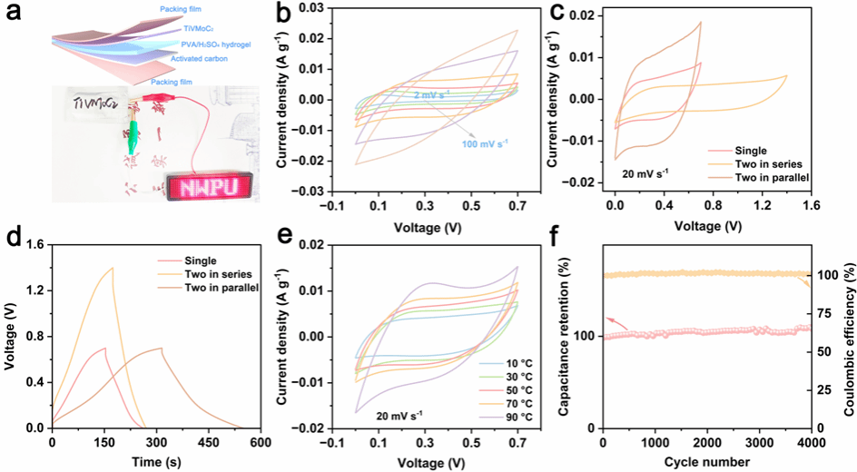图6. (a) 柔性准固态可充电超级电容器的结构示意图与光学照片。(b) TiVMoC2基超级电容器在2-100 mV s-1扫描速率下的循环伏安曲线。超级电容器器件串联或并联的电化学性能:(c) 在20 mV s-1下的循环伏安曲线,(d) 在2 A g-1下的恒电流充放电曲线。(e) 该器件的宽温度范围性能。(f) 在2 A g-1下的循环稳定性。
