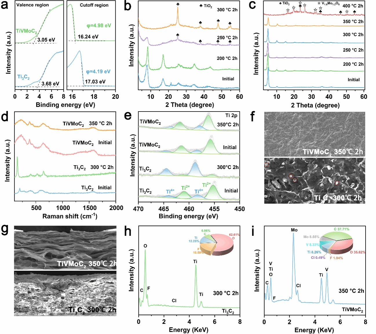 图2. (a) Ti3C2和TiVMoC2薄膜的UPS光谱。(b-c) 在不同温度的空气环境中进行热处理后Ti3C2和TiVMoC2薄膜的XRD图谱。热处理前后的Ti3C2和TiVMoC2薄膜的(d) 拉曼光谱和(e) Ti 2p XPS 光谱。热处理后的Ti3C2和TiVMoC2的(f-g) SEM图和(h-i) EDS结果。