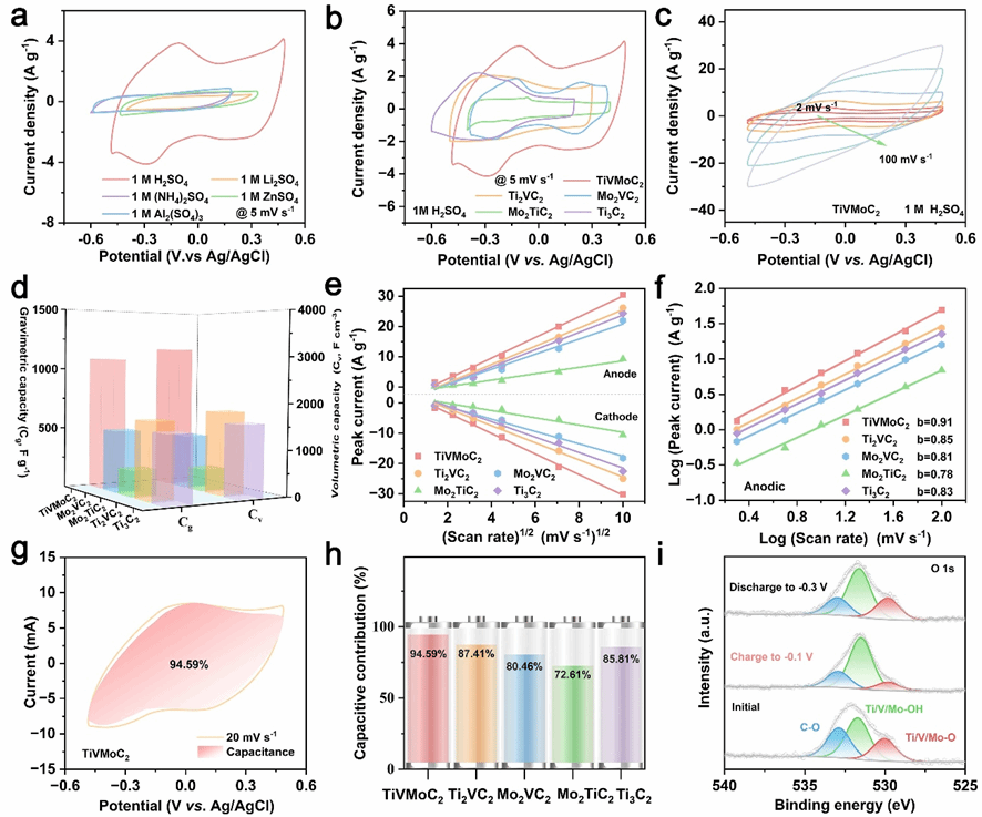 图4. (a) 在不同水系电解液中TiVMoC2电极在5 mV s-1扫速下的CV曲线,(b)五种膜电极在5 mV s-1下的CV曲线,(c) TiVMoC2电极在2-100 mV s-1下的CV曲线。(d) 五种膜电极的质量比容量和体积比容量。(e-f) 五种膜电极阳极和阴极峰值电流与扫描速率的关系。(g) TiVMoC2电极在20 mV s-1下CV曲线中电容占总电荷的阴影面积,(h) 五种膜电极的电容贡献。(i) TiVMoC2薄膜电极在特定充放电电位下的非原位O 1s XPS光谱。