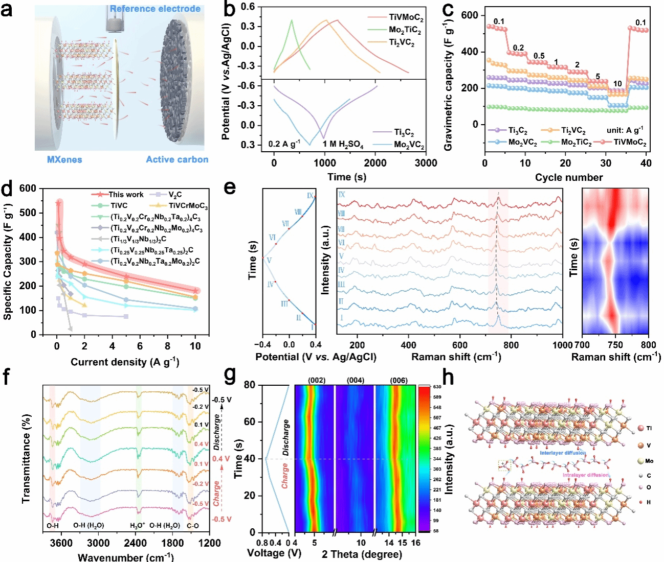 图3. (a) 三电极测试系统示意图。5种MXene膜电极的(b) GCD曲线和(c) 倍率性能。(d) TiVMoC2与其它固溶型MXene的性能对比。TiVMoC2电极的(e) 原位Raman、(f) 非原位FT-IR和(g) 原位XRD。(h) 基于Grotthuss机制的MXene层间质子转移示意图。