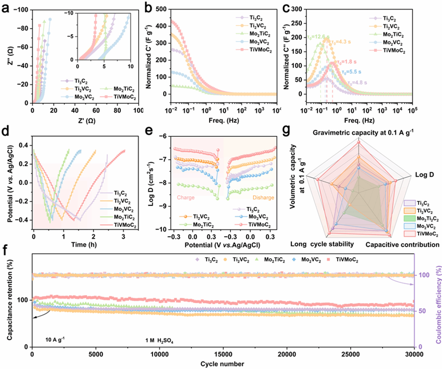 随着风能、太阳能等间歇性可再生能源的快速部署,电网对高性能储能系统的需求日益迫切。混合超级电容器(HSCs)能够兼顾高能量密度与高功率密度,在平抑电网波动、平衡供需方面展现出巨大潜力。实现这一潜力的关键在于开发具有高能量/功率密度、快速反应能力和长寿命的电极材料。针对二维Ti3C2 MXene在实际应用中面临的层间易重堆叠、高电压下发生不可逆氧化和本征活性位点偏低等问题限制,本研究提出了一种原子尺度的固溶调控策略:在Ti3C2骨架中植入Mo和V原子锚定强化MXene框架制备了中熵结构的TiVMoC2 MXene以实现结构稳定性和电化学活性的协同强化。其中,电负性强的Mo增强了M-C键的共价性质,提高了MXene的抗氧化性能,同时具有多种氧化态的V调节了局部电荷密度增强了Ti3C2的赝电容性能。得益于这种结构-活性协同调控机制,在1 M H2SO4中,在5 mV s-1下TiVMoC2电极具有1081.6 F g-1和3125.0 F cm-3的超高重量和体积电容。此外,10A g-1的高电流密度下,3万次循环后仍能保持初始容量的90.8%,其性能远优于传统的Ti3C2和其他双金属MXene。原位和外原位电化学表征表明,质子可以沿着氢键网络在MXene层之间可逆地插入和脱插入,诱导Ti、V和Mo等金属的可逆氧化和还原,属于典型的质子耦合电子传递机制。第一性原理计算表明,Ti、V和Mo原子间的强轨道相互作用使金属d带中心靠近费米能级,并缩小了其与O 2p轨道的能隙。这一电子结构调控有效促进了质子吸附,并降低了离子扩散能垒。该研究为解决M3X2型MXene的结构降解和电化学活性不足问题提供了可行策略,为设计用于下一代储能的高性能、长寿命MXene电极指明了新方向。