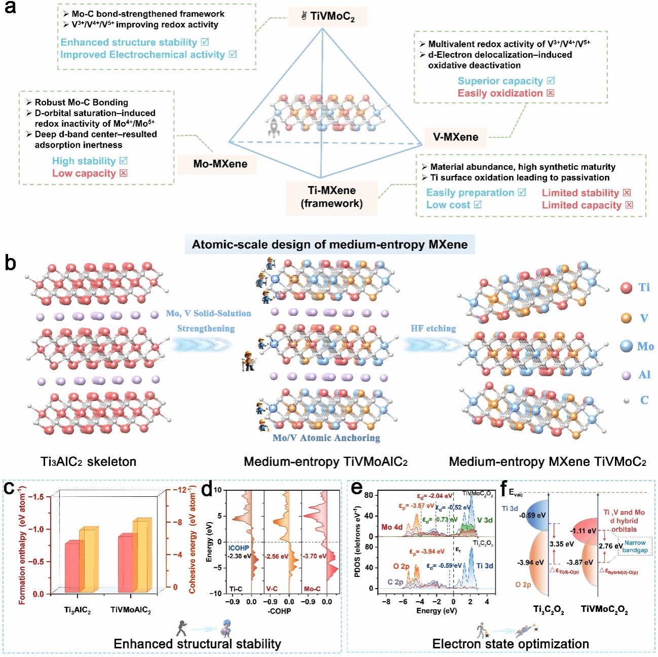 图1. TiVMoC2的设计与DFT预测:TiVMoC2的(a) 设计示意图与(b) 制备流程。(c) Ti3AlC2和TiVMoAlC2的形成焓(ΔHf)与解离能(Ec)计算结果。(d) Ti-C、V-C和Mo-C键COHP分析。Ti3C2O2与TiVMoC2O2的(e) 投影态密度和(f) d/p轨道能级分布。