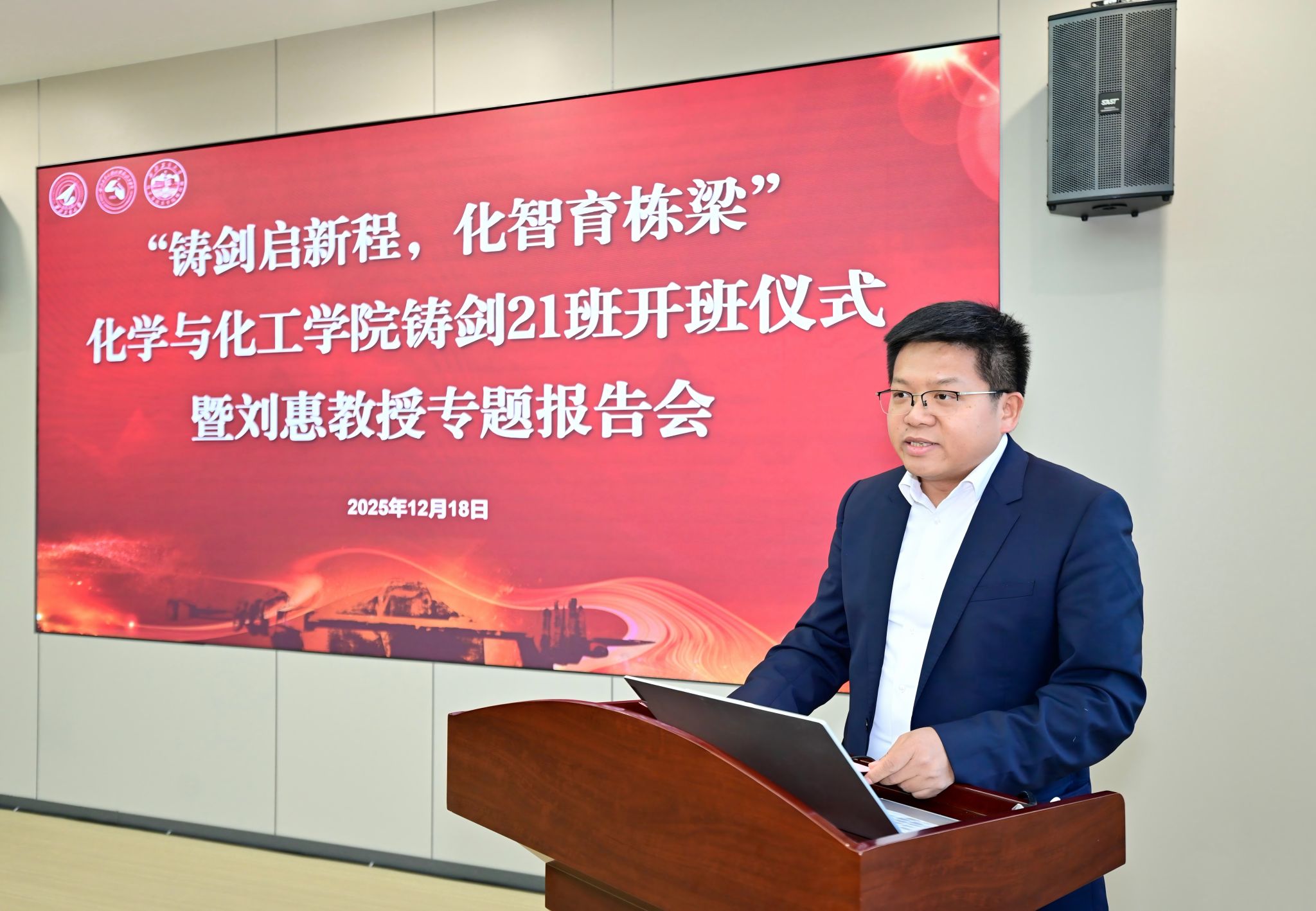 党委学生工作部部长于辉对长期以来在学校人才培养工作中辛勤付出的学院领导班子及老师们表示衷心感谢,并对化学与化工学院“铸剑班”的全体同学们提出三点期望:一是铸就忠诚奉献之“魂”,希望同学们深刻领悟“铸剑”精神的内涵,自觉将个人理想追求融入国家发展大局,践行报国使命;二是锤炼过硬本领之“刃”,勉励同学们打牢专业基础,勇攀科研高峰,以扎实学识与创新实力锻造面向未来的竞争力;三是磨砺坚韧不拔之“志”,期待同学们始终保持探索热情与昂扬斗志,在直面挑战中超越自我,努力成长为堪当民族复兴大任的时代新人。