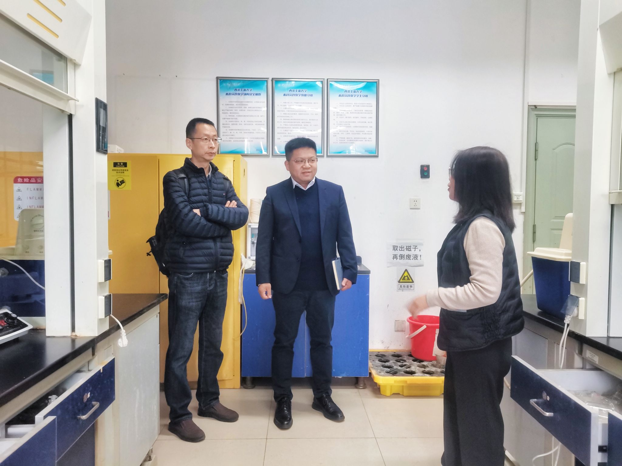 随后,傅茂森一行前往学院陕西省化学实验教学示范中心,全面检查仪器设备运行状态、课程备课进度、耗材储备及环境卫生等情况。傅茂森指出,实验教学中心是学院本科人才培养的大本营,是落实“总师型”才培养的核心阵地,要以“总师育人文化”为引领,严格落实安全责任,持续优化服务保障机制,确保实验课程安全规范运行,为培养拔尖创新人才提供有力支撑。