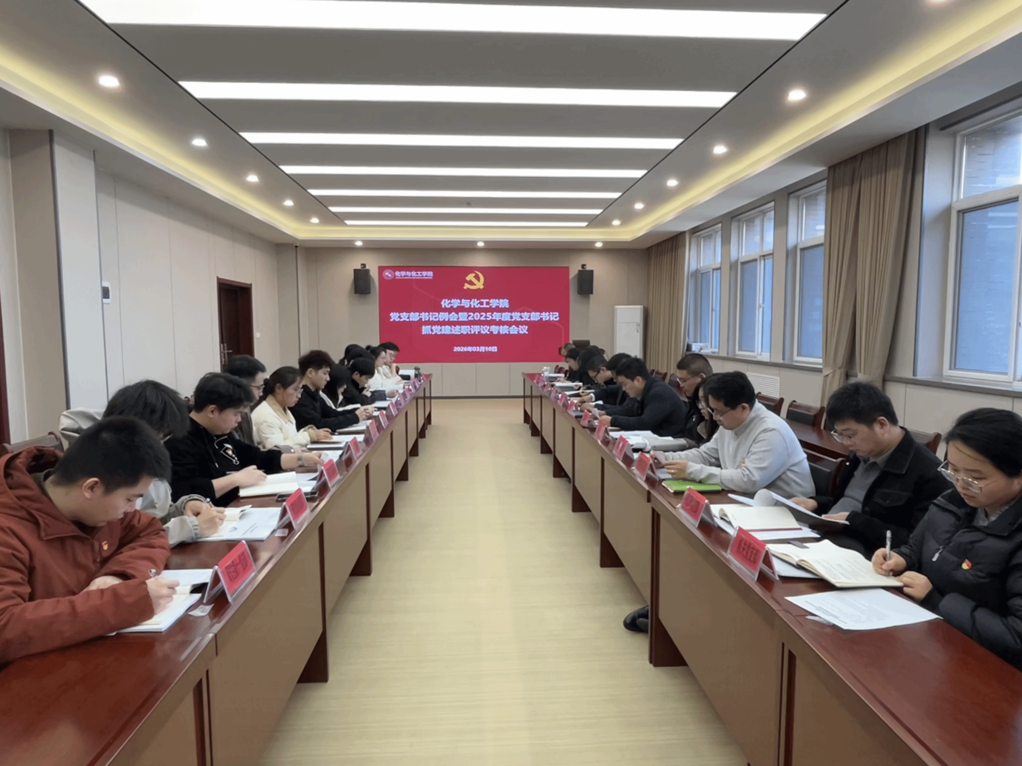 3月10日下午,化学与化工学院召开党支部书记例会暨2025年度党支部书记抓党建述职评议考核会议。学院党委委员、党支部书记、辅导员及师生党员代表参会,会议由学院党委副书记姚东东主持。