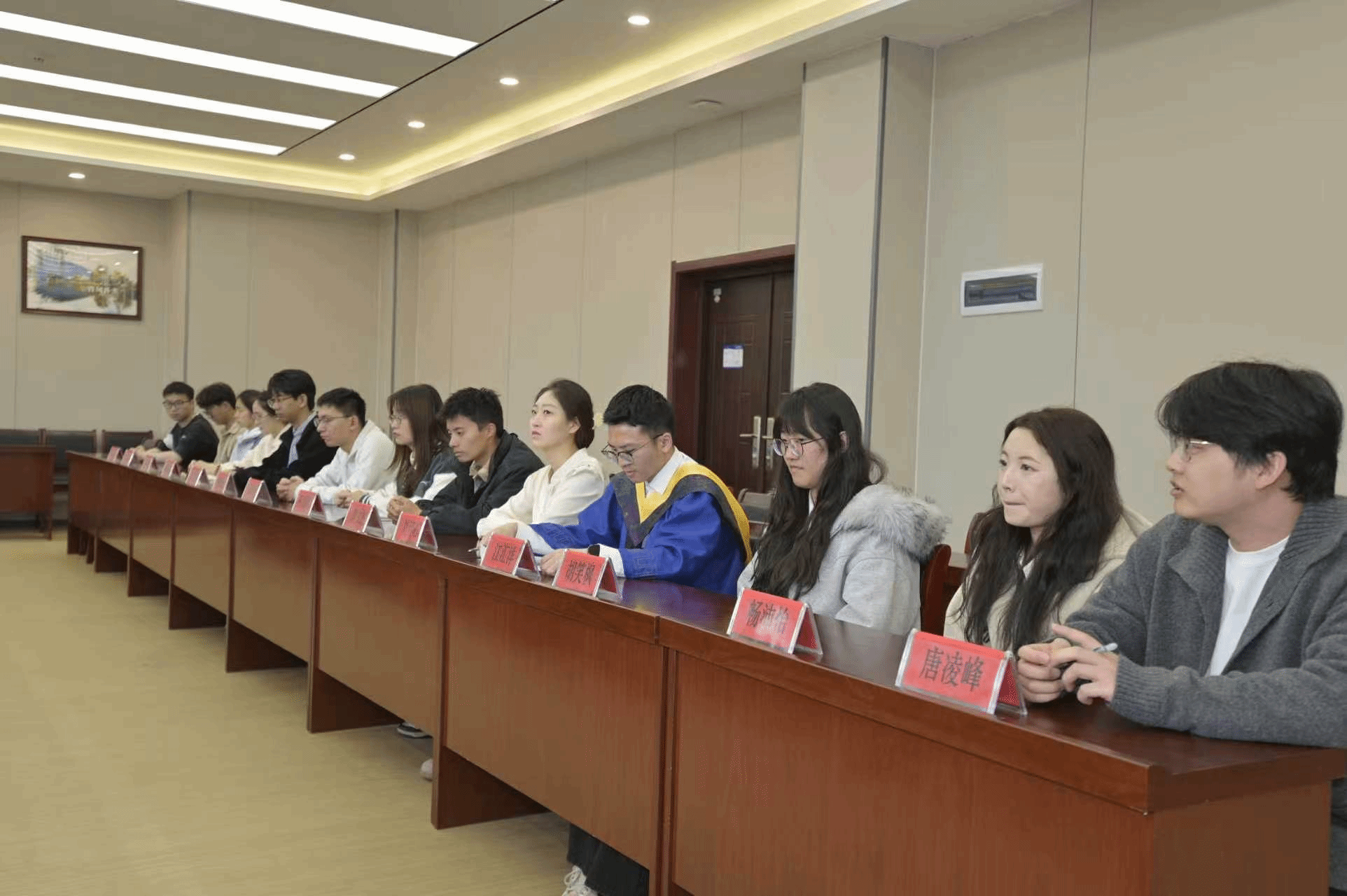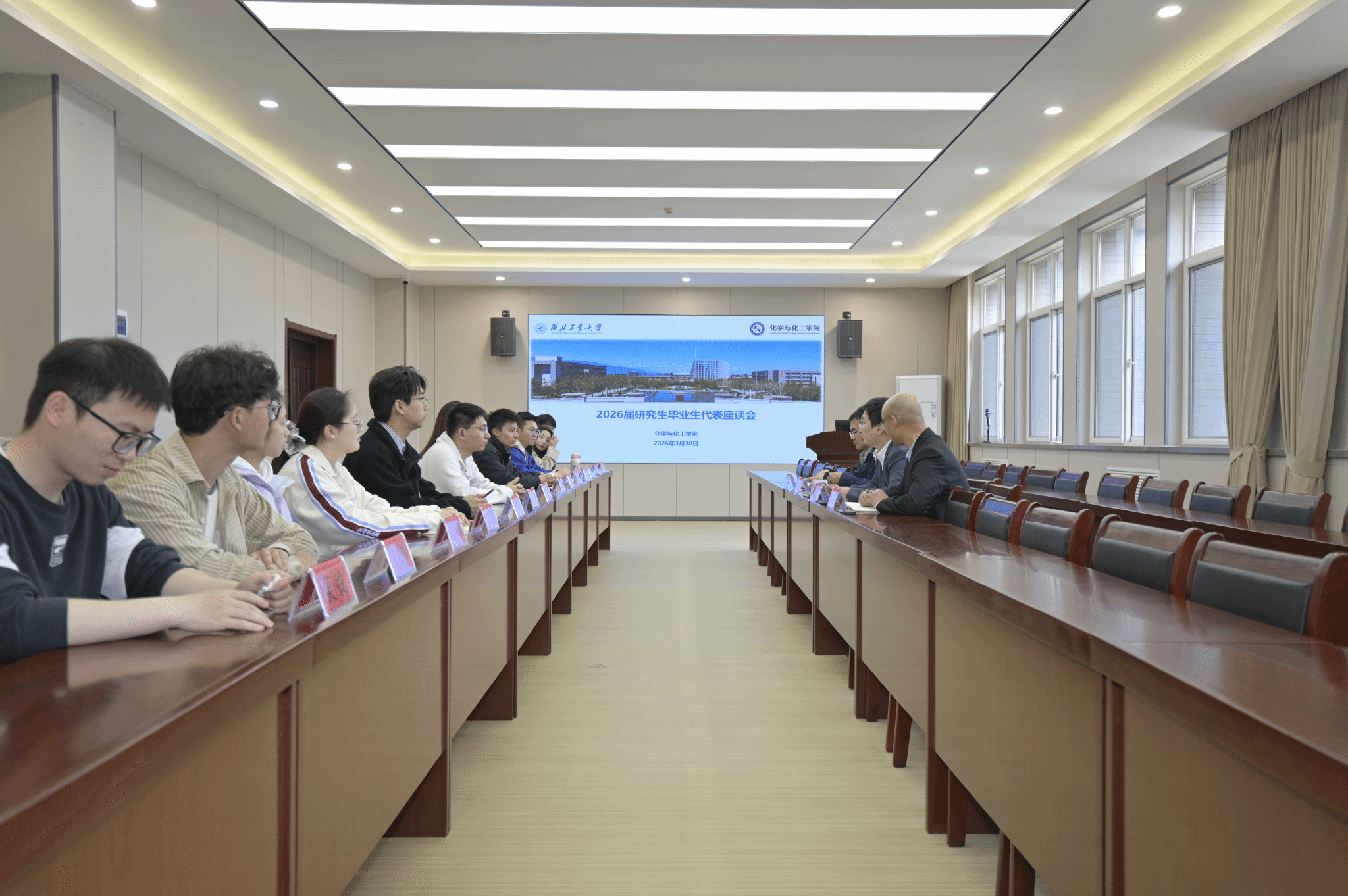 3月30日下午,化学与化工学院2026届研究生毕业生代表座谈会在学院楼258会议室召开,学院党委书记傅茂森、党委副书记姚东东、研究生辅导员马忠雷、潘富平以及15位优秀研究生毕业生代表参加。座谈会由姚东东主持。